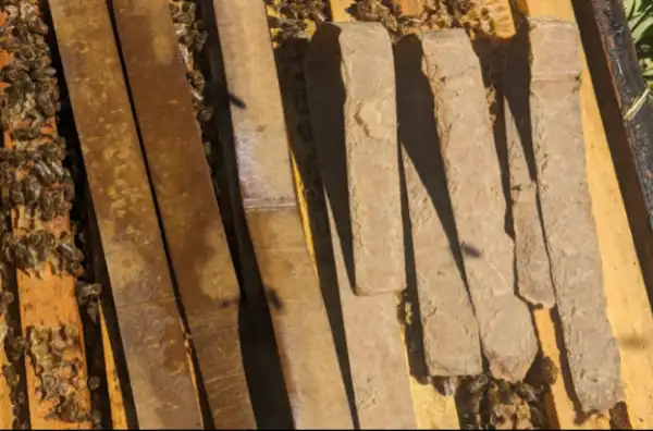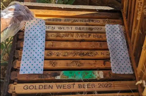 شکل ۵: شاهد مثبت ما اسفنج سوئدی (برند If You Care) بود که نصف شده و روی بالای قاب های جعبه پایینی لارو، در جلو و عقب کندو، در مرکز خوشه قرار گرفت. این روش امکان تغذیهٔ مکمل گرده را برای تشویق پرورش لارو در زمان کمبود فراهم کرد (تا کنهها بتوانند تولیدمثل کنند).
