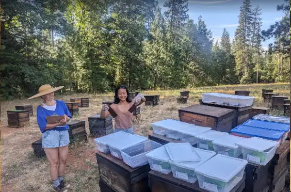 شکل ۲: همه کندوهای آزمایشی در پنج زنبورستان شمارهگذاری شدند، بر اساس تعداد اولیهٔ کنهها مرتب گردیدند و سپس درمانها بهصورت تصادفی به هر گروه ۱۸ تایی (طراحی بلوک تصادفی) تخصیص یافت. در هر زنبورستان، ۱۸ ظرف حاوی درمان توزیع شد و با دقت بسیار، درمان مناسب به هر کندو اعمال گردید. در اینجا، «Brooke» بهعنوان ناظر «Hawk» بر کار «Rose» نظارت میکرد و ثبت مینمود که هر درمان از ظرف درست برداشته و روی کندوی صحیح قرار گرفته است.