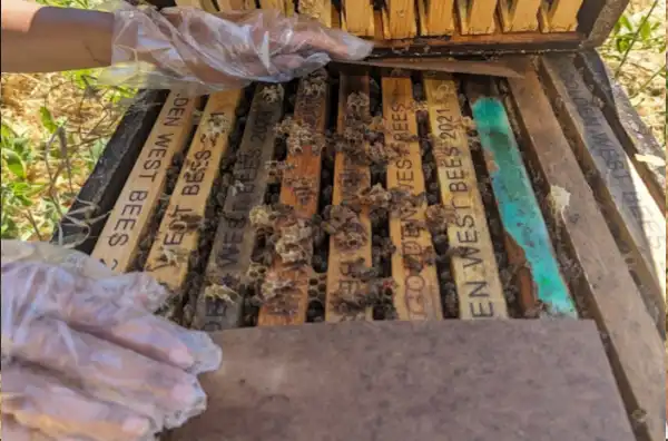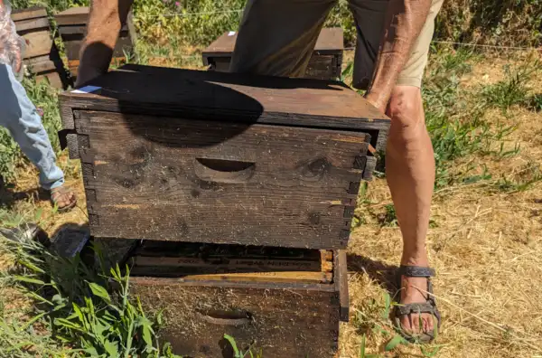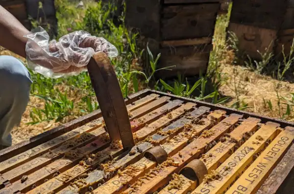 شکل ۳: هنگام آمادهسازی آزمایش، هوا بسیار گرم بود (شکل ۴) و من خودم جعبههای سنگین را برای بازرسی و قرار دادن درمانها باز میکردم. سطح درپوشهای تیرهٔ کندوها به بیش از ۶۶ درجهٔ سانتیگراد میرسید و تماس با آنها باعث انتقال گرمای شدیدی به دستان من میشد.گاهی مجبور میشدم برای جلوگیری از گرمازدگی، از بلند کردن جعبههای سنگین صرف نظر کنم! خوشبختانه زنبورهای ما آرام بودند و نیازی به لباس محافظتی زیاد وجود نداشت.