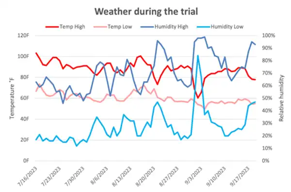 شکل ۴. در زمان انجام آزمون شستوشوی کنهها و اجرای تیمارها، هوا بسیار گرم و خشک آغاز شد و سپس اندکی خنکتر گردید. رطوبت روزانه در ابتدا پایین بود، اما در اوایل سپتامبر برای مدت کوتاهی بالا رفت (در طول دوره آزمایش هیچ بارانی نبارید).