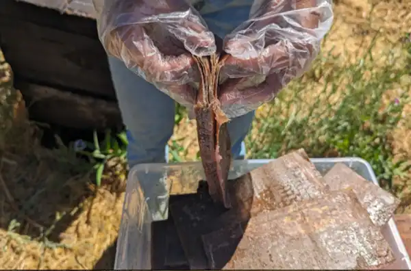 شکل ۶: در آزمایشهای اولیه، مقوای موجدار کنار گذاشته شد، زیرا چسب آن در محلول داغ اگزالیک از هم میپاشید. اما اخیراً جعبهای با مقوای موجدار دولایه و سازگار با محیط زیست مشاهده کردم و در آزمایش کوتاهی مشاهده شد که چسب آن ممکن است مناسب باشد. این مقوا مقدار زیادی محلول اگزالیک جذب میکرد، بنابراین به دلیل دسترسپذیری و قیمت مناسب، برای زنبورداران اقتصادی در آزمایش گنجانده شد.