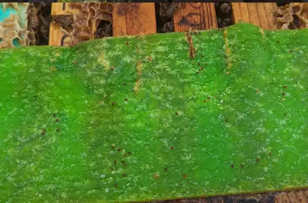 شکل ۱۱: اگرچه دیدن کنههای مرده روی پدها خوشحالکننده است، اما بعید است که مرگ آنها به دلیل تماس مستقیم باشد. در واقع، مقدار اسیدی که از پدها به بدن زنبورها منتقل میشود، عامل اصلی تأثیرگذاری است. سطح مرطوب این اسفنج به دلیل جذب رطوبت خوشه توسط گلیسیرین (رطوبتگیر) است.