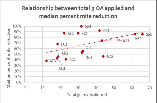 بهروزرسانی: مشخص است که برای اثربخشی خوب نیازی به ۵۰ گرم اسید اگزالیک نیست. محصول جدید واروکسان حاوی ۷ گرم اسید اگزالیک دیهیدرات در هر نوار است و برای هر کندو ۴ نوار توصیه میشود، یعنی تنها ۲۸ گرم، که دادههای بالا این مقدار را تأیید میکنند.