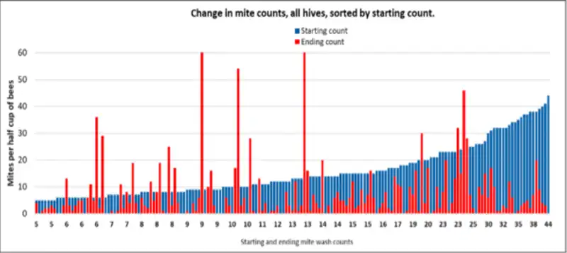 نکته مهم: نمودار اثربخشی درمان را نشان نمیدهد، بلکه فقط کاهش (در اکثر موارد) نسبت به تعداد اولیه کنهها را نشان میدهد. در کندوهایی که ستون قرمز آنها بلندتر از ستون آبی نیست، نرخ آلودگی کنه افزایش نیافته (و در اکثر موارد کاهش یافته است). ستونها برای دید بهتر روی هم قرار گرفتهاند؛ اگر رنگ آبی دیده شود، تعداد کنههای آن کلنی کاهش یافته است. ستونهایی با رنگ آبی غالب نشاندهنده اثربخشی بالا هستند، اما به دلیل نبود گروه شاهد منفی، مقدار دقیق اثربخشی قابلمحاسبه نیست.