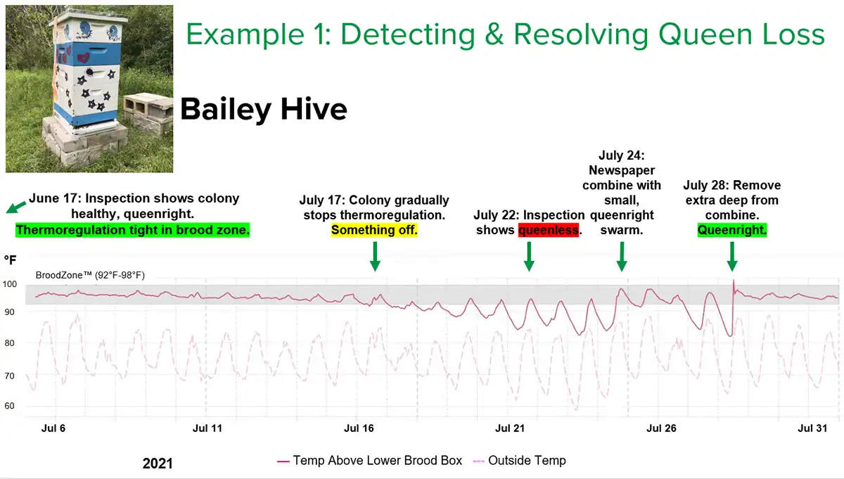 از آنجا که زنبورهای کارگر دمای لانه لارو را تنظیم میکنند، حسگر دما میتواند نشاندهنده نبود ملکه در کلنی باشد. این موضوع زنبوردار را به بررسی وضعیت ملکه واداشته و پیشرفت کلنی را پس از اقدامات اصلاحی نشان میدهد.
