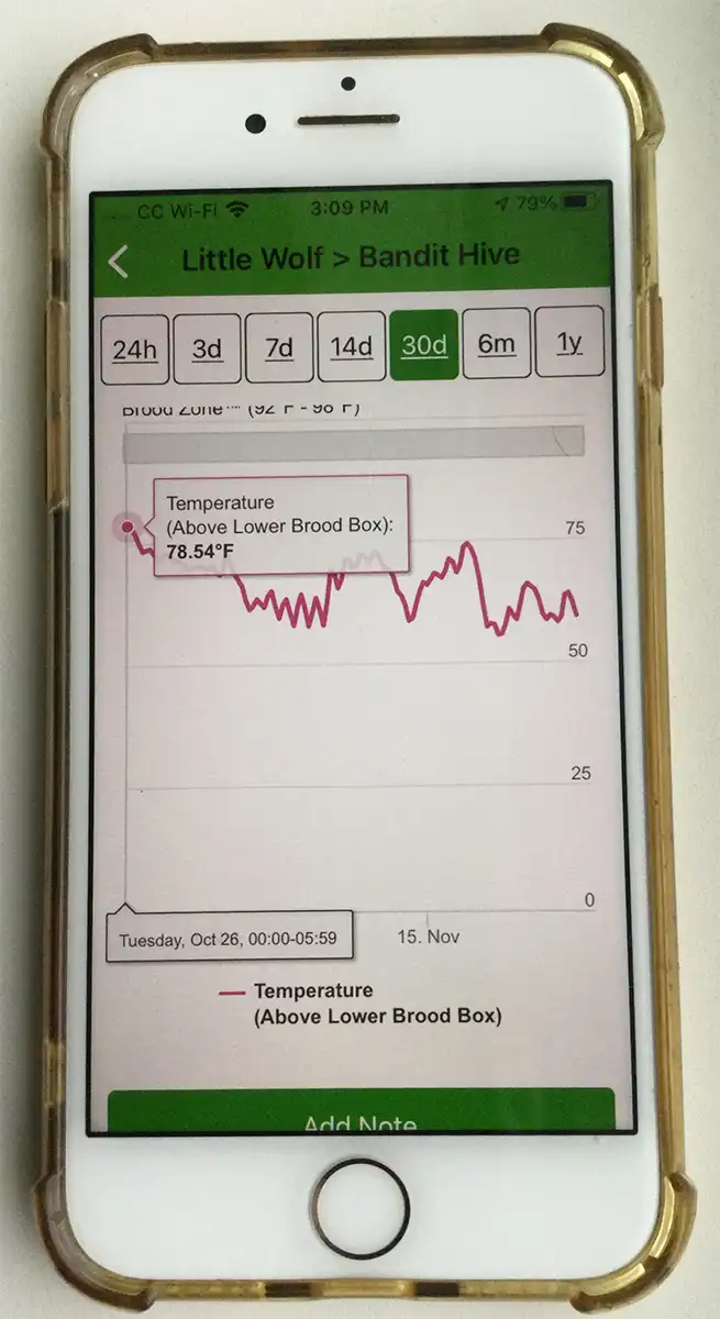 شکل ۲: برنامه Bees App نمودار کندوی باندیت را روی گوشی هوشمندم نشان میدهد. مشاهده این نمودار کنار کندو به زنبوردار امکان میدهد در صورت نیاز، سریع اقدام کند.